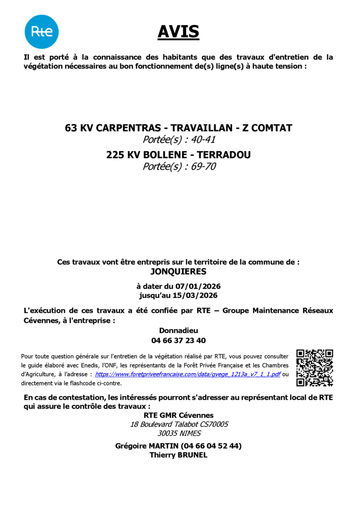 Des travaux d’élagage et d’abattage de la végétation vont être entrepris du 7 janvier au 15 mars 2026 sur la commune de Jonquières, afin d’assurer le bon fonctionnement des lignes hautes tension mais également la sécurité des personnes aux abords de ces ouvrages.