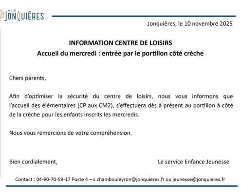Le service Enfance Jeunesse vous informe qu'afin d’optimiser la sécurité du centre de loisirs, l’accueil des élémentaires (CP aux CM2) s’effectuera dès à présent au portillon à côté de la crèche pour les enfants inscrits les…
