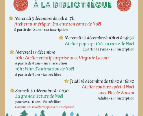 Tout le mois de décembre, petits et grands sont invités à vivre la magie des fêtes à la bibliothèque : ateliers créatifs, puzzle, lectures, séance de cinéma, couture et pleins d’autres découvertes… De quoi s’émerveiller, créer…