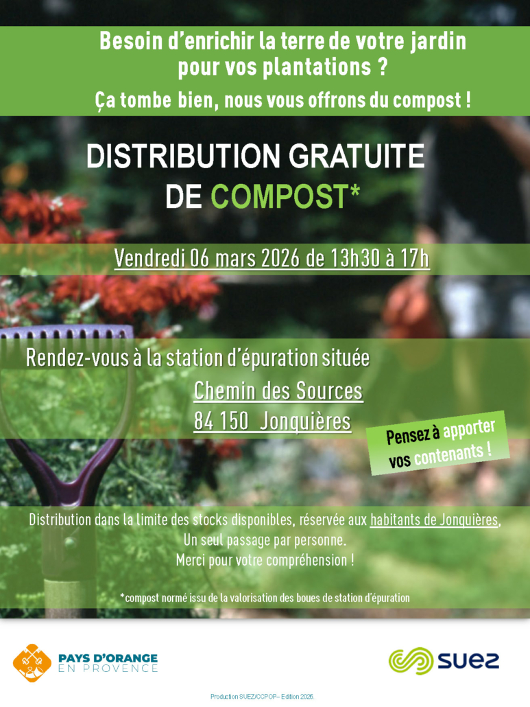 Le Pays d’Orange en Provence vous informe que SUEZ, dans le cadre du nouveau contrat de Délégation de Service Public, procédera à une distribution gratuite de compost une fois par an sur l’ensemble des communes de l’intercommunalité.