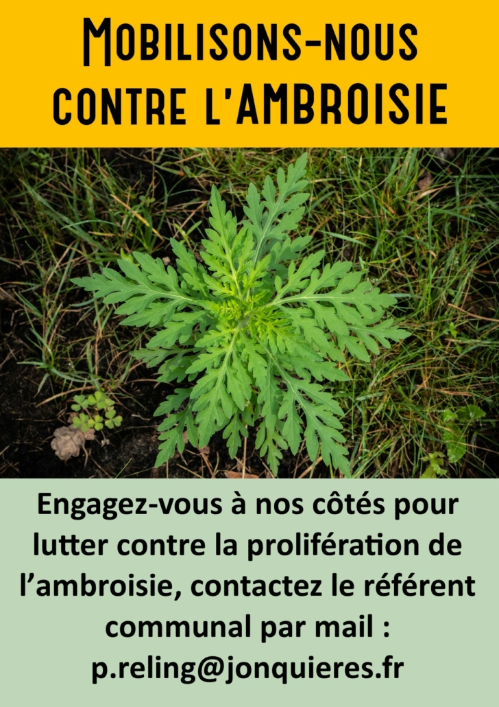 👉 Face à cet enjeu, nous lançons un appel : Vous souhaitez vous engager à nos côtés pour lutter contre la prolifération de l’ambroisie, contactez le référent communal par mail : p.reling@jonquieres.fr.
