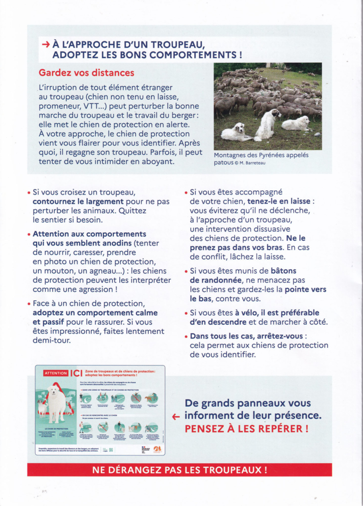 Lors de vos balades, vous pourriez rencontrer des chiens de protection accompagnant les moutons. Ces chiens sont essentiels à la sécurité du troupeau et peuvent se montrer très protecteurs. Même s’ils paraissent amicaux, ils travaillent et doivent rester concentrés.